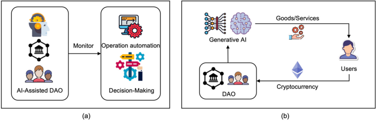 Figure 1: Integration of DAO and AI. (a) AI-assisted decentralized governance of operation automation (b) DAO-AI revenue model through AI-generated products and services.