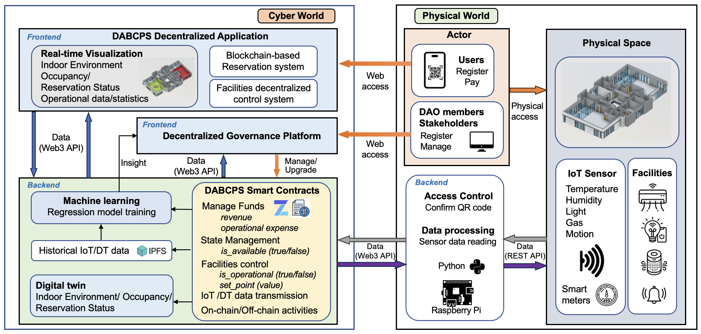 Figure 2: Proposed Decentralized Autonomous Building Cyber-Physical System (Orange arrow: Human interaction on the CPS, Grey arrow: Data from Physical to Cyber system, purple arrow: Response from Cyber to Physical system).